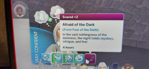 So, right at the beginning of doing the Cozy Celebrations event, not one, but both my Sims in my household got munched on by the cowplant, and they both got the "Fear of the Dark" trait, among other things, like not being able to garden. I bought Fear-B-Gone potions for my Sims to drink, curing all of them of the "looming dread" that was the "Fear of the Dark" trait, as well as for any additional fear they tacked on, but for every other time they walked outside, they get a Scared +2 moodlet "Afraid of the Dark" every time regardless of what the time of day is. I tried to give someone back in the old Answers HQ the save file with the problem but it appears I have to sign in again.