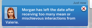 I was controlling my Sim Valerie, the ENTIRE time; I have autonomy off and was running small talk and flirting responses the entire date. There were no mean or michievous interactions. They were satisfied, with good compatability. All of a sudden I got a popup asking to change their romance dynamic to "strained" and this notification.
