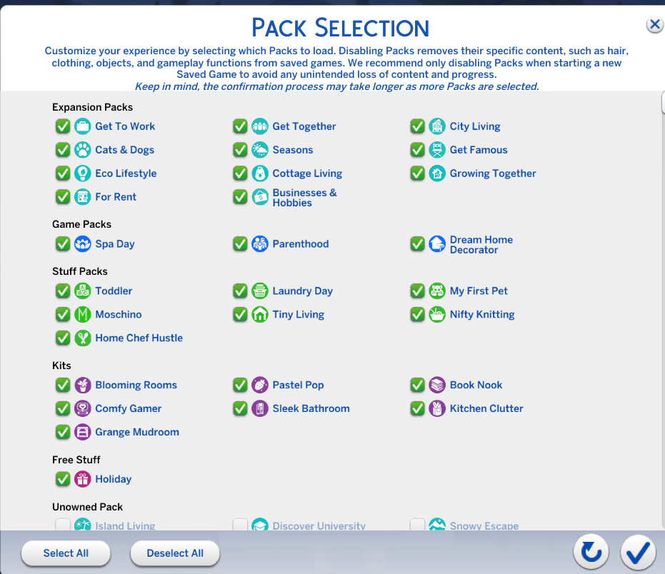 I don't own all the packs and I have added a screenshot of the ones I do have. Let me know if there is any other information that would be helpful.
