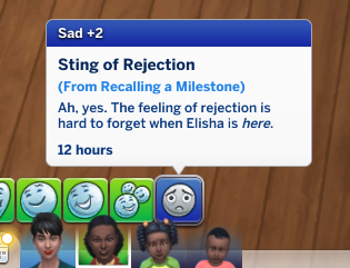 Hey, this seems to have expanded to also include milestones? My sims are now getting moodlets for milestones that they don't have. I'm playing rotationally in Mt. Komorebi. Some of these have become contagious. The ghost one I've only seen the one time, but sims from a bunch of different households are getting the bladder one and the rejection one. In the bladder situation, several people did /see/ a sim lose control of her bladder, but nobody got a milestone from it, including the sim who actually had the bladder failure. The rejection one I'm not even really sure where it came from, maybe from Megumi and Naoki divorcing? But people from a bunch of different families (who didn't see that happen) keep getting it periodically.