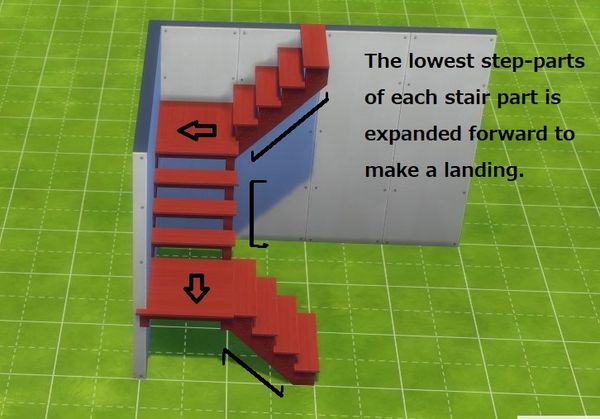 It seems the the landing created at the bottom of the upper stairs is made by enlarging the size of the stair step parts. Therefore, depending on the shape of the step parts, this issue is thought to occur in the parts that come into contact with the wall.