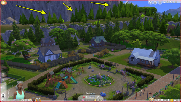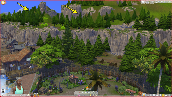 What makes it even stranger is that along the bay coast, when looking out from the pier, you can clearly see these same low-quality pine trees. Yet, right next to them, there’s another tree and a different type of pine that display normally with a higher-quality LOD. The contrast is very noticeable (the low-quality ones are marked with a yellow arrow, while the ones rendering properly are marked with a red arrow).