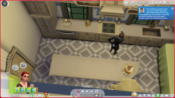 The butlers doesn't cook when ordered, says there's is no room/counters, but my own Sim does because there's is room and everything's actually fine.