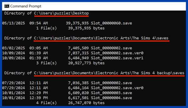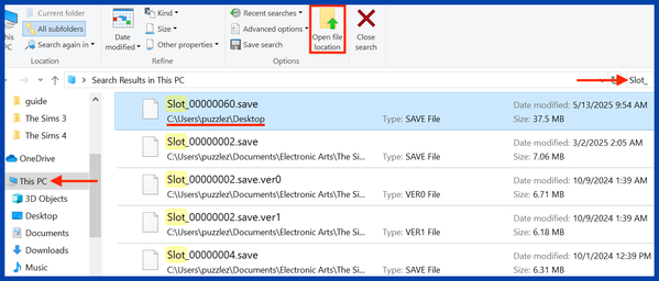 The asterisks at the end of Tray and Mods are in case the folders have been renamed, for example if OneDrive detected duplicates.  (The asterisk means "any extra characters can be here.")  Results for a search for Slot_ should look something like this: