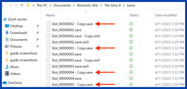 For each file with a red arrow, I would need to change its number to something higher than 00000005 (the highest I have) and remove the - Copy from the name.  The ones with a .ver0 extension are copies of backups, so I could ignore them unless the main saves with the same number were missing or didn't load in-game.