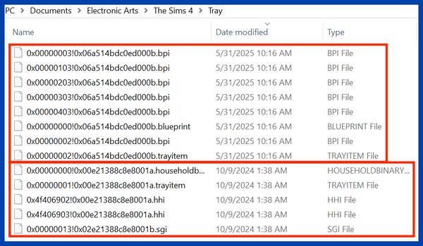 Tray file names are more obtuse, but if you see - Copy or extra characters in the name, delete these.  Each in-game Library item (a household or build) will have several associated Tray files, the number and types depending on the content.  Each Library item's files are created at the same time, so you can sort the folder by modified date to group them together.  The names should look like this; you'll notice that the file names are mostly the same for a given item.