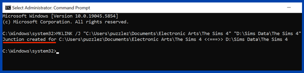 Note that the file paths in the command need to end with the same folder name: the name of the folder that's the subject of the symlink. If you're playing in Spanish, French, German, or Dutch, your folder name will be localized (e.g. Los Sims 4), so be sure to account for that in both parts of the command.