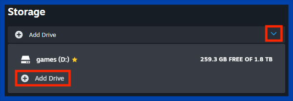To change the location of this library within Steam, select Steam > Settings > Storage, click the arrow to the right of your drive name, and click the + Add Drive button:
