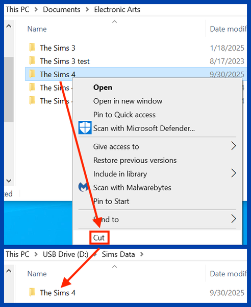 Close the game, open a File Explorer window, and navigate to this Sims 4 folder. Right-click this folder and select Cut. Navigate to the location where you want this data, right-click the empty space, and select Paste. Wait for the process to complete, which may take a while if your Sims 4 folder is large and/or the drive you're using is slow.
