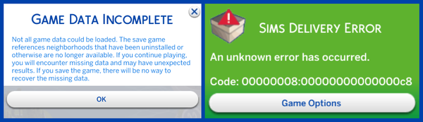 - "Game Data Incomplete": Some of your content isn't loading. Load a new save and look around. If you're missing EA content (DLC), refer to this guide. If you're missing mods or custom content, post in the Mods & CC forum.