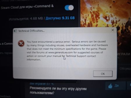 Купил по скидке в Стим всю линию Command & Conquer™, установил Generals Zero Hour и начал играть. Первую проблему которую встретил я не мог на нуоте делать сохранения, когда как на компе мог, но даладно не считал большой проблемой. Вторая проблема была что не запускалась 1 раз на 5 входов, характерное окно запуска игры которое сидело много времени что бы потом выдавало ошибку, и потом после недели не захода в игру, это ошибка выскакивает каждый раз при попытке запустить игру. Помогите пожалуйста!(прикрепляю фото ошибки ниже)Solved