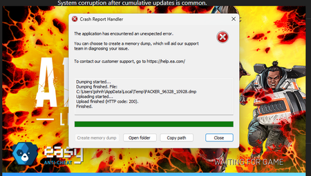 I play Apex on my PC using Steam, but about a week ago I started getting the message "Unable to connect to EA servers (anti-cheat code authentication timeout)" when I start Apex. The internet itself is working fine, and I've tried reinstalling Apex and repairing easy anti-cheat several times but it hasn't fixed the problem. However, games other than Apex, such as Valorant and Street Fighter 6, work fine. Also, for those currently experiencing issues caused by Windows updates, the latest update data has been uninstalled, so I don't think it has anything to do with this issue. If I have been banned for using cheats, it is a false ban and I would like to ask for it to be lifted. I apologize for the inconvenience, but could you please help me resolve this issue? Thank you.Memory crash dump / Apex legends