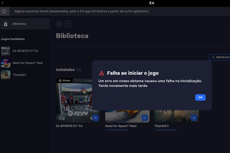 estou com esse erro do nada nao sei porque ontem estava jogando normal ja desinstalei e instalei o EA 24 ja desinstalei o anti-cheat ja abri o ea app como adm ja desativei o antivirus ja permitir todos os app no Windows defender e nadaSolved1.2KViews2likes10CommentsMEU JOGO NÃO ABRE