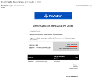 Olá pessoal! Comprei via PlayStation Store o Battlefield 6 Edição Phantom - pré venda, realizei o donwload com antecedência como informado, e ao acessar o jogo verifiquei que os benefícios da edição Phantom não foram liberadas para o meu usuário.! Está dizendo que preciso comprar! - Reparei também que ao navegar pela PS Store o mesmo não fica habilitado e indicada a compra do Standard e dentro do próprio jogo. Claro, mesmo assim estou jogando - fico na dúvida agora de como irie se beneficiar do itens do Phantom?!?!?! Segue print da transação e etc. Obrigado e ficaria no aguardo!
