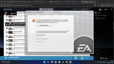Hello everyone, I need help with a Battlefield 3 issue and EA Support is not letting me create a support ticket. Here are the details: - I own Battlefield 3 on THREE EA accounts. - TWO accounts can join servers normally. - ONE account (___el2PP) cannot join *any* server — every attempt shows: "Error Could not join server (1)". - I was able to play on this account recently. - I have tried: • clearing cache and cookies, • restarting the EA App, • using a different network (mobile hotspot), • and other local troubleshooting. - Other accounts on the same PC + network still work. - When I try to contact EA Support about this, the support form does **not actually create a case** — nothing appears in My Cases. Please, if anyone has advice or if EA staff see this and can escalate it, I would really appreciate some help. Thank you!HELP!!! BF3 - Asking for Product Key? Won't Load Game!!!