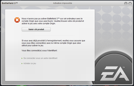Salut à tous, J'ai installé l'app EA pour rejouer à BF3, j'ai utilisé mon compte mais quand je lance une partie (multijoueur ou solo) via battlelog, ça m'indique cette erreur : Alors que le jeu m'appartient bien, j'ai toujours le CD PC Premium avec la clé que j'ai déjà utilisé bien sûr. Dans battlelog avec le même compte, mes progressions sont toujours là. Dans l'app EA > mes jeux, BF3 apparait bien même quand c'est pas installé donc ça prouve bien que le jeu m'appartient. À l'époque je jouais beaucoup via l'app Origin, je ne sais pas si c'est le switch d'un système à l'autre qui cause ce problème. Pourriez-vous m'aider s'il vous plait? MerciSolvedCompte Origin inexistant - Bibliothèque perdue ?