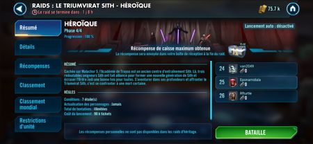Quand je lance le raid du triumvirat sith phase 4. l'académie de Trayus, le sith avec 3 sabres lasers violets qui sont en lévitation, la simulation se lance pour le démarrage, je n'ai même pas le temps de lancer le combat que déjà il me fait la simulation comme si j'avais gagné, j'ai le message "VICTOIRE" mais sans avoir combattu et avec 0 points de gagnés. Quelqu'un d'autre a ça ? Je n'ai pas ce phénomène avec les autres phases du même raid... En pièce jointe la vidéo de ce qu'il se passe exactement 👇🏻