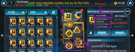 This topic keeps coming up -- primarily with folks who struggle with an overflowing mod inventory, but others as well. I am just ... not a video creator. Not my bag. So I'm going to post this here and link back to it as necessary when someone on the forums looks like they need some advice with mod basics. What are mods? How do we talk about them? Mods are equipment for your character that affects the final stats of that character. Unlike gear or relic mats, however, mods can be unequipped from one character and moved to another - or simply sold for credits (never as much as you invested). This allows you to upgrade the mods on your best toons as you gain a new best mod of a particular type. Then you can hand down your old best mods to characters that are good, but maybe not your best. Let's look at the mod screen for my account's version of The Stranger: The dots indicate a quality known as "rarity" and currently run from 1 dot to 6 dots. Mods from 1 to 4 dots in rarity are worthless. Do not save these mods. Mods from 1 dot to 5 dot all have the same border, a kind of grey. 6-dot mods gain a gold border instead. Since you won't be saving 1-dot to 4-dot mods, you can generally use that border color to tell you at a glance whether a mod is 5-dot or 6-dot. Each mod gives 5 bonuses, and contributes to what might be another. I say "might be" because the last bonus is a "set bonus". When you collect enough mods of the same type on a character (the required number is always either 2 or 4), you gain the set bonus. But each mod individually gives you its primary bonus and 4 secondary bonuses. Each primary gives a fixed bonus. The amount of your bonus is NEVER random. Each secondary gives a random bonus, and also it can gain multiple increments of that bonus. Once a mod is sufficiently upgraded to have 4 secondaries exposed, with each future improvement that grants a secondary roll, you "roll" an additional hit of some secondary you've already acquired. No matter how much you improve your mod, you can never have more than 5 rolls on a single characteristic. Nor can you have more than 8 total rolls on a 5-dot mod or 12 total rolls on a 6-dot mod. This produces wide variations in how large a bonus a given secondary provides. Each bonus is random, and you can have 1 to 5 doses, further separating the meagre bonuses from the fat ones. There are 12 possible secondaries. Apart from a rule that a mod cannot have a secondary bonus of the same type as its primary bonus, any of the 12 possible secondaries can appear on any given mod. But since one is typically ruled out by the "no matching the primary rule" and since there are only 4 slots for possible secondaries, you generally have a 4-in-11 chance of any given secondary appearing on any given mod. Decent odds, but by no means great. Finally, notice that each mod has a shape to it, and each character has 1 slot available for each of the 6 possible shapes. Two mods with the same shape can never be placed on the same character. There are always the same 6 slots on every character, one of each shape, and you must match your mod shapes to the slot shapes. Ultimately this will force you to acquire mods that effectively duplicate each other but fit different slots, so that when it is important you can put 6 different mods on a character that all boost the same stats. That focussed improvement is how randomly selected mods provide reasonable bonuses, but carefully selected mods grant amazing performance boosts. The next posts will focus on other aspects of mods -- most importantly, how do you know when when a mod is great or good? When to hold on and when to sell a mod? That's going to be the single most important skill in developing your mod inventory, and there don't seem to be many good places to learn it. So let's tackle that, shall we?136Views5likes6CommentsMissing GAC 3v3 Opportunity for Krennic's Touch Up!
