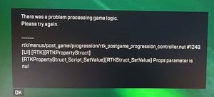 Apex Legends is exposing internal RTK/Nut script errors suring post-match progression. The error shows the full scripts path and functions. This should probably be hidden behind a generic error message. rtk/menus/post_game/progression/rtk_postgame_progression_controller.nut #1248 [RTKPropertyStruct_Script_SetValue] Props parameter is null @Respawn / @Playapex97Views2likes4Commentsmy apex is bugging please help