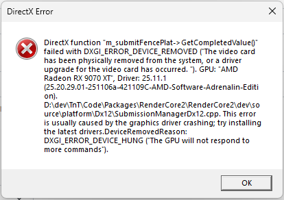 Why do I always get kicked out of Battlefield 6, whether it’s multiplayer or Red Sec? I can play any other game, whether it’s Flight Sim or ARC. I have hard reset, factory reset, uninstalled, and reinstalled the game, and it’s the same thing over and over. I have a fan on my box. It gets up to 108 degrees. If the fan is off, it gets to 122 degrees, which is still within normal limits, but I always get kicked out. I am hardwired into my router; I get 500mb, which isn’t bad. Please can somebody help me?45Views0likes5CommentsDirectX function "m_submitFencePlat->GetCompletedValue()"
