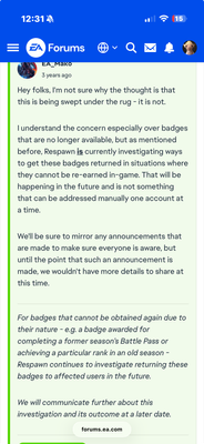 @EA_Mako Has there been any word on the fixing of missing badges that were earned by purchasing battlepasses? I have been stripped of almost all of my badges because of the AI generated system. I would like to speak to someone about this that can help resolve this issue. If they can go and help the bigger names to retrieve all of their stuff that they earned and paid for fair and square then why cant the smaller names get what they deserve as well?Solved1.1KViews3likes21CommentsCross progression, PS account gone