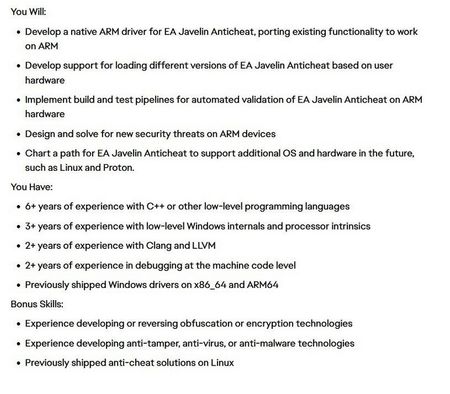 EA recherche un profil capable de développer : Un pilote ARM natif pour EA Javelin Anticheat », d’« implémenter des pipelines de build et de test pour valider automatiquement la solution sur matériel ARM », de « concevoir des réponses aux nouvelles menaces de sécurité propres aux appareils ARM » Mais aussi de « définir une feuille de route permettant à Javelin de prendre en charge d’autres systèmes d’exploitation et plateformes matérielles, comme Linux et Proton ».Au sujet de : "Battlefield 6 – Indicateurs Anti-Cheat – Janvier"