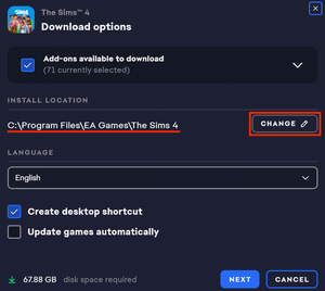 Overview Sims 4 takes up a lot of space, sometimes more than a computer or drive can comfortably fit. This guide covers options for moving game data elsewhere. jump to: Benefits and drawbacks jump to: Installing to a custom location jump to: Moving the Documents folder jump to: Moving the user folder via symbolic link This guide is for Windows. Mac users, please see this article. Installing and playing this game results in two separate Sims 4 folders: one that contains the game's program files and one that contains user data. Program files are what the EA App installs, in the location of your choice, or C:\Program Files\EA Games by default. User data consists of saves, Tray files, mods, etc., and the game always expects this folder to be in Documents > Electronic Arts. If the folder isn't there, the game will create a new one with no content rather than looking for the data elsewhere on your computer. These folders can be stored almost anywhere you want, but they should never be combined. Doing so comes with a variety of risks, up to and including permanent loss of your saves. If the Sims 4 folders will be on the same drive, create separate parent folders to contain them, for example D:\Games\The Sims 4 and D:\Sims Data\The Sims 4. Benefits and drawbacks The main benefit to moving your game data is freeing up space on the drive(s) that currently contain it. For the overall health of your computer, your system drive (C) should always have at least 25-30 GB free, more if you're frequently working with large files. Other drives need at least some free space too; how much depends on general usage and the type of drive, with mechanical drives (HDDs) especially slowing down significantly when close to full. The game's program files will occupy just under 70 GB with all current packs installed; the size of the user folder depends on what you place in it, of course. A large custom content collection can be hundreds of gigabytes and might not fit on a smaller system drive at all. Some people also organize their data in such a way that it's more convenient to use custom locations for games and associated files. The main drawback is that the speed of a secondary drive, especially an external one, is unlikely to match the speed of your system drive, so loading times may be noticeably slower. A solid state drive (SSD) is much faster than an HDD, but the connection between an external drive and your computer could be slower than the drive itself. (This is not a problem for a secondary internal drive.) For best results, look for online reviews that measure the actual read/write speeds of the drive rather than simply referencing the listed specs. Other drawbacks are mostly user error: forgetting the details of a setup, deleting a symbolic link, losing an external drive, that kind of thing. OneDrive can also cause problems; this guide covers your options for managing OneDrive settings and how to implement them. Managing OneDrive ↑ Installing to a custom location EA App jump to: Steam The EA App will install all games to C:\Program Files\EA Games by default, but during the install process, you can select a different folder under Install Location. This location can be almost anywhere, but it should not be on the root level of the drive. For example, if you're installing to a new drive D, create a folder, e.g. D:\Games\The Sims 4, and install Sims 4 into that; don't install directly to D:\The Sims 4. If you've already installed the game and want to move its location, it would be best to uninstall through the EA App (Sims 4 > Manage > Uninstall), then reinstall to the new location. However, if your download speeds are slow enough that reinstalling would be a burden, you can try a workaround first. Close the EA App and make sure the EABackgroundService is NOT running in the Task Manager. Right-click the Sims 4 folder that contains the program files and select Cut. Right-click empty space inside the folder where you want the game to go and select Paste. Wait for your computer to finish transferring the data, which will take some time. When the transfer is done, open the EA App, which will see Sims 4 as uninstalled. Tell the App to download to the new location, where you pasted the program files, and it may simply verify the files and finish the install process. Or it may redownload part or all of the data—I had mixed results when testing this. If the process doesn't work correctly, you'll need to properly uninstall and reinstall the game. It's probably unnecessary to do a clean uninstall, but if you've made a mess of things (or think you might have) and want to remove all game data, please see this guide to clean-uninstalling: How to Clean-uninstall Sims 4 Steam Steam downloads games to your Steam library, which is located here by default: C:\Program Files (x86)\Steam\steamapps\common To change the location of this library within Steam, select Steam > Settings > Storage, click the arrow to the right of your drive name, and click the + Add Drive button: Under Add a new Steam library folder, select Let me choose another location, then click Add and choose the folder you'd like to use. The new folder must be empty and not on the same drive as any other Steam library. You can also change the location of an already-installed game. Create a new Steam library, as described above. In the same Storage tab, find Sims 4, check the box to its right, and click Move. Steam will do the rest. ↑ Moving the Documents folder If you would like to store your Sims 4 user data (saves, mods, etc.) on a secondary internal drive, the simplest way is to move the location of the Documents directory for your Windows account. Your computer will have several Documents folders, but Windows designates only one per account as the directory, and this is the location Sims 4 uses as well. DO NOT move the Documents folder to an external drive. Doing so can have serious consequences for your computer, particularly if the secondary drive is ev