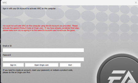 I haven't been able to start WRC for over two months now. I have uninstalled and reinstalled the EA App, WRC, the "anti-cheat" files as recommended with no success. I would get the error message that says, Yesterday, after about twp weeks of not trying, I tried again and get this error: I am definitely signed into my EA account on the EA App and launch it from there, and this error box gives me no options to "activate" the game??? This is VERY frustrating that regardless of what I try, I cannot get the game to run. HELP!!!WRC Crash