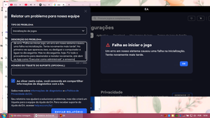 Instalei o App EA e o jogo The Sims4, mas na hora de abrir o jogo está dando erro. Já fiz a desinstalação do App EA e do Jogo The Sims4 e ao instalar novavemente e abri-los, o erro ainda continua. Fiz a limpeza das pastas e reiniciei, mas nada. Não está abrindo o jogo The Sims4, a tela carrega mas fica na cor preta e sai, mostrando uma mensagem de erro: "Falha ao iniciar jogo, um erro em nosso sistema causou uma falha na inicialização. Tente novamente mais tarde". Na primeira vez que apareceu isso, eu desliguei o computador e liguei no dia seguinte. Mas no dia seguinte, hoje. Fiz todo o procedimento para desinstalar e instalar novamente, até abrir os App como "Executar como administrador", e e mesmo assim ainda continua. Lembrando que estou entrando na minha conta. Busquei até tutoriais na internte, mas nada me ajudou, pois o problema ainda continua. Cheguei também a enviar uma mensagem para o suporte relatando pelo App EA.