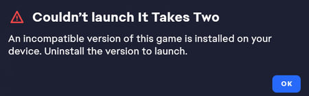 I just purchased the full version with friend pass bundle of It Takes Two for Nintendo Switch Whenever I try connect online I am getting a notification that says “You account settings have changed. Please connect again now. Code: 501-80190000” this just repeatedly pops up over and over. I have read all the help desk articles on how to resolve and nothing has worked. Unlinking/relinking, remove/redownload, adult account, brand new EA account not linked to anything other than Nintendo. I bought this specifically to play with friends while I go through chemotherapy/a transplant and I feel like I got ripped off went in circles with trying to contact EA directly with no luck. Honestly just want a refund at this point but it wont let me do that either. Please help :(701Views4likes4CommentsAn incompatible version of this game in installed on your device