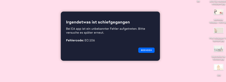 Hey. Habe bis vor Kurzem ganze normal über die EA App Sims starten und spielen können, heute öffnet sich die App nicht mehr. Es kommt ein schwarzes Fenster, dann dieser typische bunte, runde, sich drehende Kreisel, als würde etwas laden und nach kurzer Zeit "reagiert sie nicht mehr". Ich habe Softwarupdate gemacht, Macbook mehrfach neugestartet, EA App gelöscht und neu installiert. Cashe löschen kann ich nicht, zumindest komme ich nicht oben auf die Leiste. Was kann ich noch tun?SolvedFehlercode: EC:10005