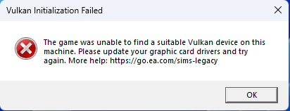 Hey everyone! I've got a paid version of Parallels for macOS I use to emulate Windows 11. The recently re-released Sims 2 collection boots just fine, but The Sims 1 provides the error message "The game was unable to find a suitable Vulkan device on this machine." I'm posting this because I feel like the emulation is part of the problem. Has anyone experienced this, and if so, how did you get around it? For reference, here are my laptop's specs: 16-inch Nov 2024 MacBook Pro Chip: Apple M4 Max Memory: 48 GB macOS: Sequoia 15.3.1146Views1like2Comments