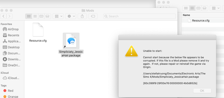 I just downloaded Sims4 for the first time and wanted to also download some mods. I came to realize that the game wont load if I have a .package file in my mods. I have tried opening Sims with one .package mod at a time and still would not work. It keep popping off as a corrupted file. I already tried repairing the game, un syncing from my icloud, and putting the file not too deep only in the mods file. I am not sure what to do because the game only runs if there is no mods or if the mods are "zipped." I tried it with many different kind of mod and it continue to not work therefore I don't think it's the mod itself have a problem. Overall, I am very confuse and want to use mods so please somebody help me I have a MacBook Air 2018!!!Back again!