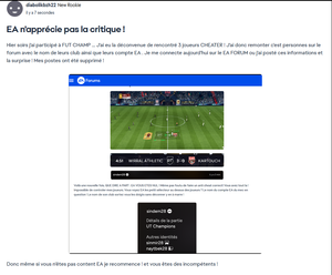 iI would like to report a serious bug i encountered during a Fut Champions match from the begining of the game i completely lost control of my players and they stpped respondingto any inputs which made it impossible to play because of this bug i lostthe match with no chance to react i have a recorded video that shows the issue clearly5Views0likes0CommentsImpression de bannissement