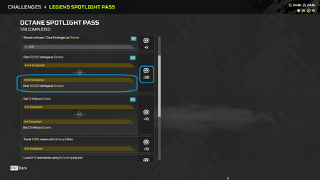 Hi, Let me start by saying, i'm absolutely not against this bug because it gave me 3 levels for free. But at the same time I have been working in software development for 15+ years, so a bug needs to be reported. One of the challenges for Octane consists of three tiers for dealing Damage: Deal 5.000 damage as Octane (+10) (-OR- deal 2.000 damage as Octane in BR) Deal 10.000 damage as Octane (+10) (-OR- deal 5.000 damage as Octane in BR) Deal 20.000 damage as Octane (+20) (-OR- deal 10.000 damage as Octane in BR) Prior to my game, which was Mixtape; Control; Storm Point; for possible repro reasons I was on the team that starts at site A, I had dealt 9.700 damage. Meaning I was 300 damage away from completing challenge T2. In the Control game I dealt approx. 2.300 damage, so I would have completed T2 and would be starting T3. (Additional info for devs; I also completed 2 event challenges and 1 daily challenge) When I proceeded to the lobby after the game I received multiple levels from the spotlight pass. Which seemed odd to me, since I only cleared a single spotlight challenge which would give me +10. After checking the potential cause for this (appreciated) free gift, I realized that once I finished the 10.000 damage (T2) it also said I completed 20.000 damage (T3). Which also explained the 3 levels I cleared, since that would be a sum of +10 (T2) & +20(T3). TL;DR: Play mixtape for damage with Octane, finish T2 & receive T3 for free.