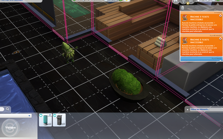 Bon, j'ai acheté à la dernière promo le pack Business et Loisirs. Je voulais faire un spa maisons, donc Loki Pipette a créé son entreprise. J'ai placé la pièce préfrabriquée secrète du savant fou. Puis j'ai placé le mannequin. Après ce message orange, alors que la machine était accessible! Je l'enlève, je veux en remettre une autre, j'ai essayé les deux autres modèles... Impossible de placer les machines à tickets car script non autorisé. La capsule aussi! Est-ce que le problème existe sur un terrain vierge? He bien non! La capsule et la machine à tickets, une fois le terrain rasé ou sur un autre terrain fonctionnent. Bon, on sauvegarde le terrain, on supprime le pack Business et loisirs incriminé pour faire disparaître potentiellement le problème et récupérer mon terrain déjà en construction. Nouvelle partie, on met mon terrain dessus. Mais le bug provenait aussi du pack travail en ce qui concerne les magasins, car maintenant, je peux placer machine à tickets et capsules. Mais ma capsule me parle de surface à pourvoir et comme si elle permettait de vendre. Avant, elle avait un message vert parlant de ventes. Elle s'était apparemment transformée en machine à tickets? Je ne me souviens plus, c'était hier soir. C'était pas grave, pour l'instant du moins je crois, donc on verra la suite du bug bientôt.Jeu de **bleep**