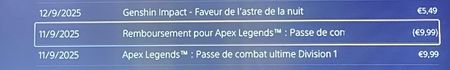 Bonjour, Je vous contacte car j’ai rencontré un problème avec mes achats du passe de combat de la Saison 27 sur Apex Legends. Voici la situation précise : J’ai acheté le Passe Premium pour 9,99 €, ce qui m’a donné : le passe de combat, les récompenses supplémentaires du Premium, ainsi que des pièces Apex (que j’ai ensuite utilisées en faisant un achat de packs). Peu de temps après, j’ai décidé d’acheter l’Ultimate (l’upgrade supérieur), car il était indiqué que cela incluait plus de récompenses. Je pensais qu’en achetant l’Ultimate après avoir acheté le Premium, je recevrais le remboursement des 950 pièces Apex correspondant au coût du passe Premium, comme c’était le fonctionnement dans les saisons précédentes. Cependant, après l’achat de l’Ultimate : je n’ai reçu aucune pièce Apex, alors que j’avais déjà payé le Premium juste avant et que je pensais légitimement que l’upgrade rembourserait la valeur du passe. Je comprends donc que le système a peut-être changé, mais je souhaitais savoir s’il serait possible : - d’obtenir un remboursement de cet achat et donc le retrait des récompenses (matières etc. qui n’ont pas été utilisées). - d’obtenir un geste commercial / compensation, étant donné que j’ai acheté deux versions du passe (Premium puis Ultimate) dans la même saison en pensant qu’il y aurait un remboursement. Je peux fournir toutes les preuves d’achat si nécessaire. Merci beaucoup pour votre aide. Bonne journée/soirée à vous et merci de votre compréhension.BUG: objet manquant