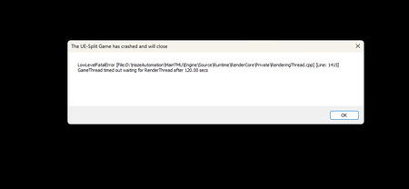 started playing a way out again recently, and out of no where, from the next time i launched the game, it always crashed, I tried reinstalling, something to do with environmental variables, launching with both dx11 and 12, and nothing changed. I keep getting the error i pasted below. if someone could help me that would be nice. LowLevelFatalError [File:E:\Haze1\Main\Engine\Source\Runtime\RenderCore\Private\RenderingThread.cpp] [Line: 815] Rendering thread exception: LowLevelFatalError [File:E:\Haze1\Main\Engine\Source\Runtime\Windows\D3D11RHI\Private\D3D11Util.cpp] [Line: 294] Direct3DDevice->CreateTexture2D(TextureDesc,SubResourceData,OutTexture2D) failed at E:\Haze1\Main\Engine\Source\Runtime\Windows\D3D11RHI\Private\D3D11Texture.cpp:441 with error E_INVALIDARG, Size=33424x828x1 Format=(0x0000002C), NumMips=1, Flags=D3D11_BIND_DEPTH_STENCIL D3D11_BIND_SHADER_RESOURCE KERNELBASE.dll!0x000000001A55A80A AWayOut.exe!0x00000000047DA76B AWayOut.exe!0x00000000047AA228 AWayOut.exe!0x0000000004C189EA AWayOut.exe!0x0000000004BF670A AWayOut.exe!0x0000000004C0E624 AWayOut.exe!0x0000000004FEAAEE AWayOut.exe!0x0000000004D96E97 AWayOut.exe!0x0000000004E5E156 AWayOut.exe!0x0000000004E579F8 AWayOut.exe!0x0000000004E57B4B AWayOut.exe!0x0000000004E58561 AWayOut.exe!0x0000000004E576D7 AWayOut.exe!0x0000000004CCEE4B AWayOut.exe!0x0000000004F07641 AWayOut.exe!0x0000000004EFAAD8 AWayOut.exe!0x0000000004739E2E AWayOut.exe!0x0000000004739FEC AWayOut.exe!0x0000000004FF7436 AWayOut.exe!0x0000000004FF74C8 AWayOut.exe!0x000000000482B647 AWayOut.exe!0x0000000004826BA7 KERNEL32.DLL!0x000000001BE7E8D7 ntdll.dll!0x000000001D1EC53C ntdll.dll!0x000000001D1EC53C15Views0likes0CommentsSplit Fiction Bug. P2 can't see P1's actions in co-op As of 1/10/2026