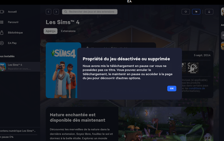 J'ai acheté et installé Nature enchantée aujourd'hui, j'ai joué mais impossible de me rendre au monde du Pack Nature enchantée. j'ai alors eteint le jeu et cliqué sur "Réparer le jeu". La réparation s'arrete d'un coup lorsqu'elle arrive au au Pack Nature enchantée, et un message d'erreur s'affiche: J'ai ensuite effacé et supprimé les caches depuis Windows et depuis l'application EA, mais l'erreur persiste. comme y remedier? merci de votre prompte réponseSolvedEa Pro et Amazon Luna + non compatibles?