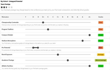 I am not sure if this is limited to just this grade template, but I believe the MySchool grades for the "Untapped Potential" template are fundamentally broken for online dynasties. I created a Team Builder school using the Untapped Potential template. According to the website, this is supposed to grant a Stadium Atmosphere grade of A, and an Athletic Facility grade of A+. Screenshot #2: When I load into the new dynasty, everything is correct. Stadium=A, Ath Fac=A+. Then you start advancing, and the problems begin. Screenshot #3: This is the transfer portal week 1, year 1. My Stadium grade is now D+ (90k fan UCLA stadium), and Ath Fac grade is now C+. This issue persists no matter how many years you advance, or how many games you win. I did multiple other tests where I did force wins for 2-3 seasons and the same thing happens. Stadium never improved over D+, and the highest the Athletic facilities got was B- as a 5* prestige school with multiple championships. THIS IS A PERVASIVE PROBLEM FOR THE COMMUNITY: Doing some sleuthing online, it appears that I am not the only person with this problem. Here are some examples of other Online Dynasty Team Builder users experiencing the EXACT SAME GLITCH. Reddit User #1 Reddit User #2 EA Forums User #1 This is a huge, Dynasty-breaking issue for those that compete in 32-man online dynasties with Team Builders. I've seen very little exposure of this issue amongst the Dynasty community and want to be sure it is written somewhere so that it can be known and addressed. I fear, though, that this is something that won't get addressed until CFB27 (if at all...).Madden 25 Team Builder NOT Working