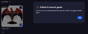 After playing DA2 Ultimate Edition (bought on Steam), it fails to launch on PC. I've been having issues with it from the start: the game wouldn't launch in full window mode and would crash frequently. Then it started having issues launching. I tried: Disabling every overlay possible (which did help at first, it seemed). Ending EA background processes. Running the game offline. Running the EA app as an administrator. EA app recovery. Verifying the file integrity in Steam. Reinstalling the EA app. Reinstalling the game. Nothing seems to be working now. The game is refusing to launch. Are there any reliable solutions, or should I just give up and get my refund? Here's the error I get:Dragon Age Inquisition server connection error
