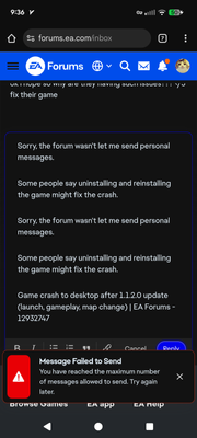 The forum notifications are broken and don't work. Sometimes I receive notifications when someone replies to a post I'm subscribed to, and sometimes I don't receive a notification. I'm referring to the notification bell at the top of the forum page. Sometimes I get notifications there, sometimes I don't. For example, I'm subscribed to the forum post in the link below, but I did not receive a notification when the poster replied to me. Dropping to 1 fps | EA Forums - 12970860 This makes it extremely difficult to provide customer support because we're not receiving notifications when people reply to posts asking for help. There's other features of the forum that are broken. Such as 'show more' and 'unread posts' features. I do like the look, layout, and custom avatars. A forum that doesn't keep track of conversations is fundamentally broken though. I've resorted to manually adding this signature to the bottom of all my posts. Otherwise I'll have no idea who replies to me in posts I'm subscribed to. If I don't reply to your post then personal message me. Sometimes the forum fails to notify me when someone replies.[Known issue] Error viewing and downloading attachments