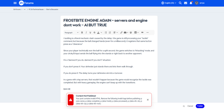I am trying to post a story with images on one of my threads, but keep getting an error message come up saying: 'This content is not published. Invalid HTML. Please remove this before posting. Lib- sim.' (no idea what the last bit means). The story is pasted in plain text from a Word doc and have tried uploading each image via the option in the bottom bar (From Computer) instead of copying and pasting but it still won't let me publish the story. There is no HTML content used in the story, it's all from my computer, so am not sure why I keep getting a message about invalid HTML content. I am wondering if it's the length that's causing issues, as when I do shorter posts with one or two images, it works perfectly fine. I notice there doesn't seem to be a spoiler option on the bar for new posts/replies after the main introductory post so I can't get the long post into a spoiler. Has anyone else had the same issue when trying to post stories (can't find related topics in Search)? And if so, have you managed to solve it?SolvedWhy Am I Not Being Notified About Things On The EA Forums?