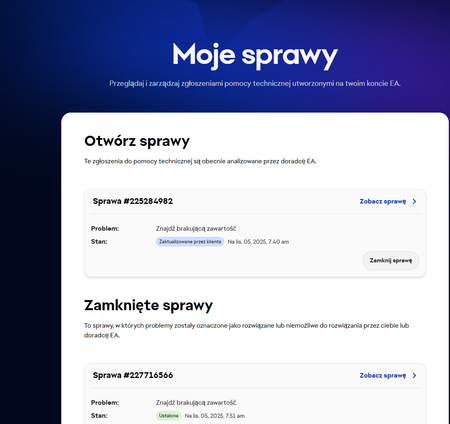 Witam Dostałem następujący email do sprawy EA: 1. Zaloguj się na swoje Konto EA. 2. Przejdź na stronę Moje sprawy. 3. Wybierz istniejącą sprawę z listy, a następnie opcję Wznów sprawę, aby rozpocząć rozmowę na czacie z doradcą. Po zalogowaniu NIE MA takiej opcji jak WZNÓW sprawę:SolvedProblem z kontem ea
