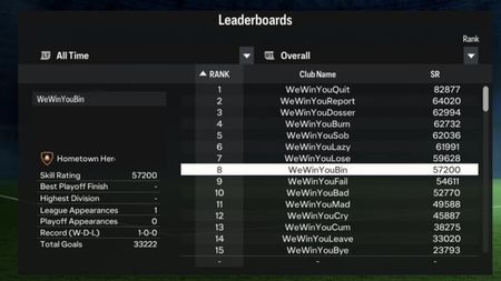 If you post team names here who are cheating you get banned and shamed. There is no way to report teams in game who are cheating, in 2023, in a multi-billion $£€ game. Pathetic! This is nothing short of a disgrace. Just look after current state of the leaderboards in the screenshot below DO SOMETHING @EA1.3KViews6likes13Comments